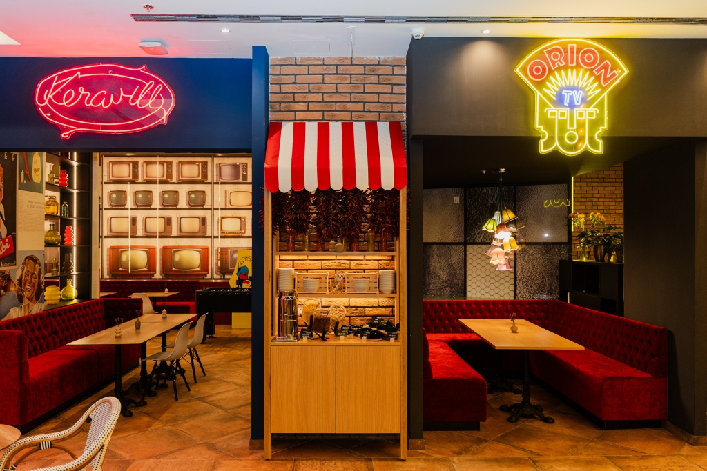 Az igazi hintákkal kialakított bár körül tematikus sarkok idézik fel a ’60-as, ’70-es és ’80-as évek hangulatát: neonfeliratok, retró játékgépek és vintage reklámplakátok teremtik meg az időutazás atmoszféráját. A falakon olyan, a magyarok számára ismerős márkák jelennek meg, mint az Orion, a Keravill, a Fabulon, a Zwack vagy a Tibi.